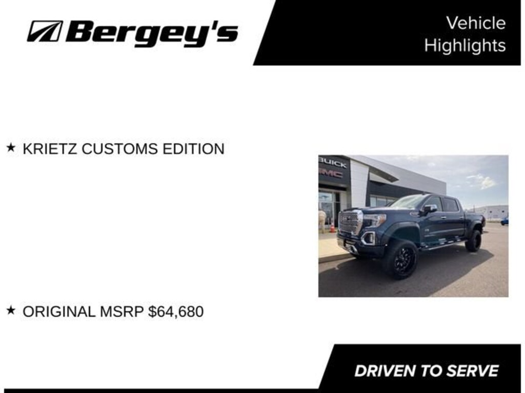 Elevate your driving experience with this exceptional 2021 GMC Sierra 1500 Denali. This vehicle is a true testament to power, style, and uncompromising quality.- KRIETZ CUSTOMS EDITION- ORIGINAL MSRP $64,680- Pacific Blue Metallic- 6.2L V8 (EcoTec3) engine with Dynamic Fuel Management- Sunroof, power- Bose 7-speaker premium audio system- Navigation system- Heated and ventilated front seats- Wireless charging- Trailer brake controller- 20-inch multi-dimensional polished aluminum wheelsThe Sierra 1500 Denali is engineered to exceed your expectations. Its powerful 6.2L V8 engine, paired with a smooth-shifting 10-speed automatic transmission, delivers an exceptional blend of performance and efficiency. With 420 horsepower and 460 lb-ft of torque, this truck is ready to tackle any task, whether it's hauling heavy loads or conquering the open road.The Sierra's striking exterior design commands attention, with its bold Denali grille, chrome accents, and distinctive LED lighting. Step inside the cabin, and you'll be surrounded by premium materials and advanced technology. The heated and ventilated front seats, along with the Bose sound system, create a truly luxurious driving experience.Utility and convenience are also at the forefront of this Sierra's design. The in-vehicle trailering app, integrated trailer brake controller, and 120-volt power outlets make towing and hauling a breeze. The wireless charging pad and 4G LTE Wi-Fi hotspot keep you connected and powered up on the go.Whether you're tackling tough jobs or seeking a refined and capable daily driver, this 2021 GMC Sierra 1500 Denali is the perfect choice. Experience the power, style, and uncompromising quality that make this truck a true standout in its class. Visit our showroom today and let us demonstrate how this Sierra can elevate your driving experience.