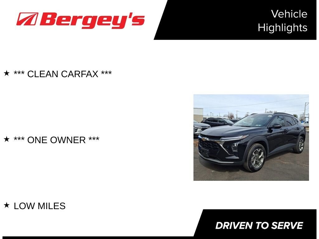 Discover the perfect blend of style, performance, and convenience in the 2025 Chevrolet Trax LT. This compact SUV is a true standout, offering a remarkable combination of features that cater to your every need.- Low Mileage- One Owner- Clean CARFAXElevate your driving experience with the LT Convenience Package, which includes keyless entry, heated seats, a heated steering wheel, and more. The license plate front mounting package adds a sleek, integrated look to the exterior.Powered by a 1.2L I3 DI Turbocharged engine, the Trax LT delivers an impressive 137 horsepower and an efficient 28 city / 32 highway MPG. The 6-speed automatic transmission and front-wheel drive provide a smooth and responsive ride, making every journey a pleasure.This Trax LT is a certified pre-owned vehicle, giving you the peace of mind that comes with a thorough inspection and comprehensive warranty coverage. You can trust that this SUV has been meticulously maintained and is ready to provide you with years of reliable service.Step inside and experience the comfort and convenience of the Trax LT's well-appointed interior. The cloth/Evotex seating surfaces are both stylish and durable, while the 6-way manual driver's seat and 4-way manual front passenger seat ensure a perfect fit. The 6-speaker audio system with SiriusXM keeps you entertained, and the Chevrolet Infotainment 3 system provides seamless connectivity.Safety is a top priority, with features like dual front impact airbags, dual front side impact airbags, and electronic stability control ensuring your protection on the road. The rear-view camera and OnStar emergency communication system add an extra layer of security.Don't miss your chance to make this 2025 Chevrolet Trax LT your own. Schedule a test drive today and discover the perfect balance of practicality, performance, and style that this compact SUV has to offer.